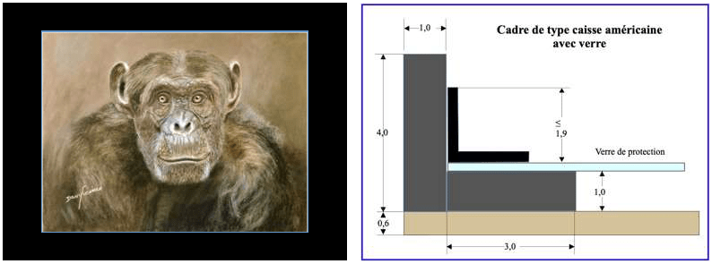 125 € pour une caisse américaine avec montage spécial verre de 60 x 80 cm (exemple ci-dessous), avec verre clair, pour pastel de 47 x 61 cm,