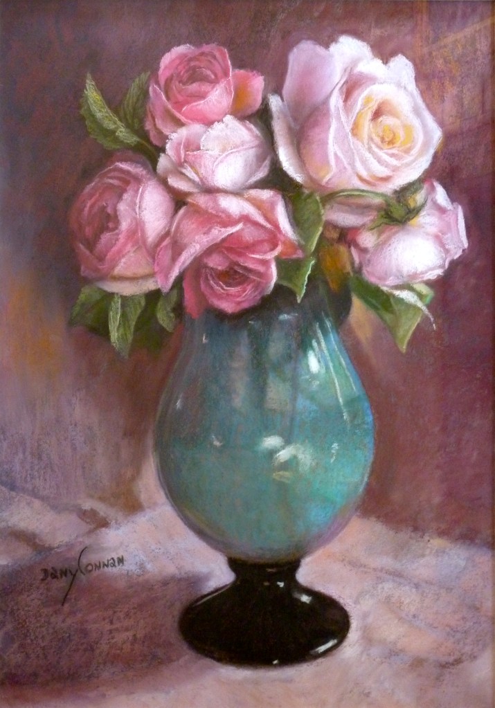 Roses dans un vase vert (Pastel 47 x 61 cm) Roses in a green vase (Pastel 18″ x 24″) (Prix de l’œuvre sous-verre hors cadre650 €)