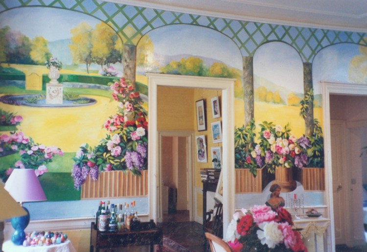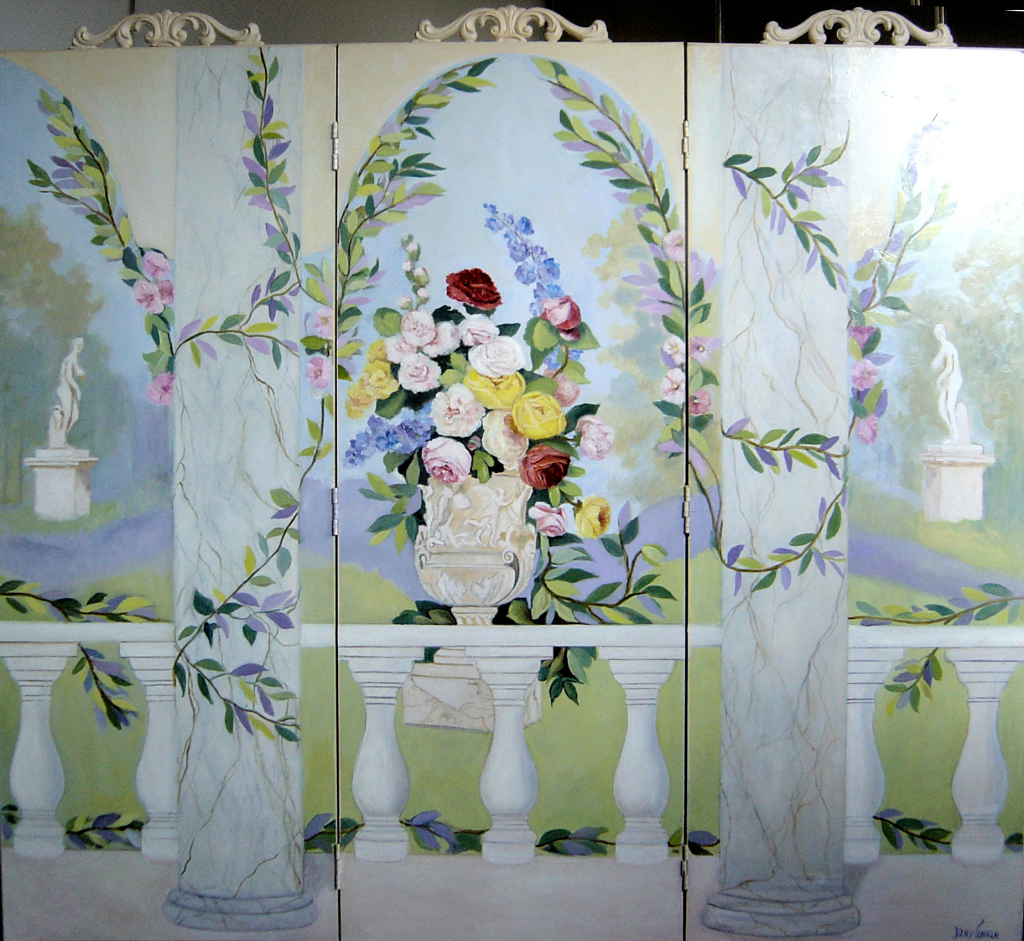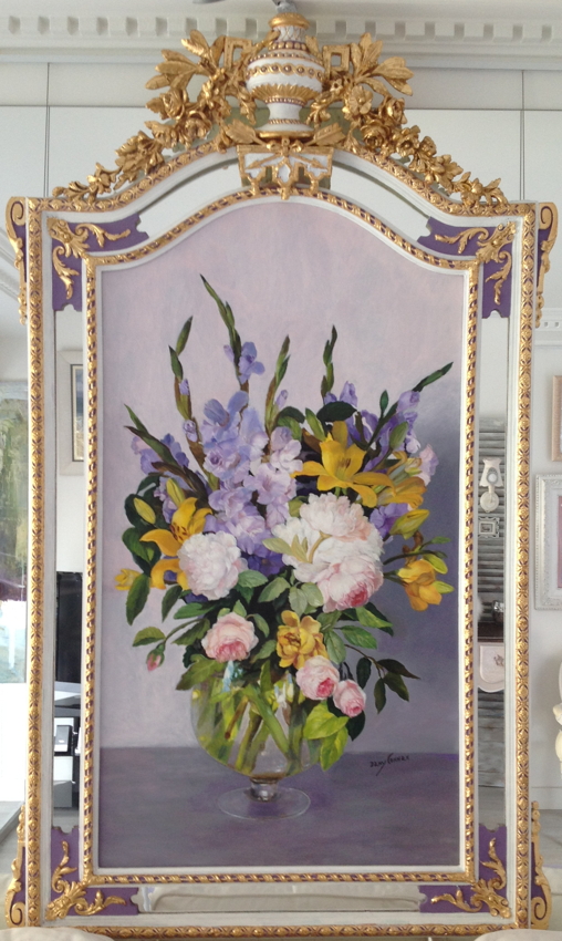 Bouquet in a frame with glazing beads regilt in the gold leaf (Oil on wood 25″ x 46″)